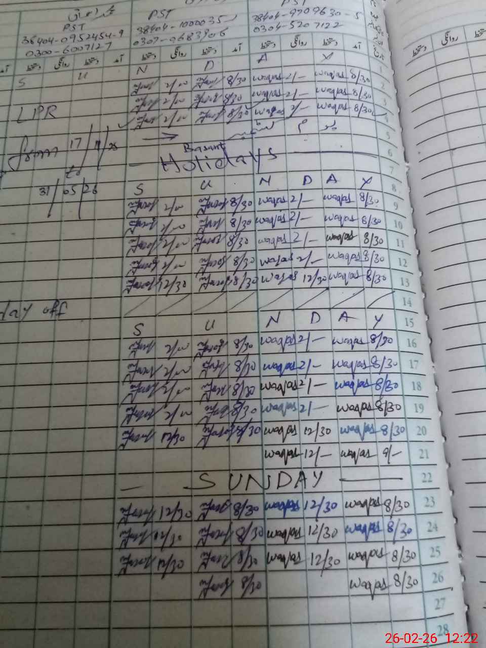 | Leave | Duty | Absent | Maternity | Medical | Ex- Pak |