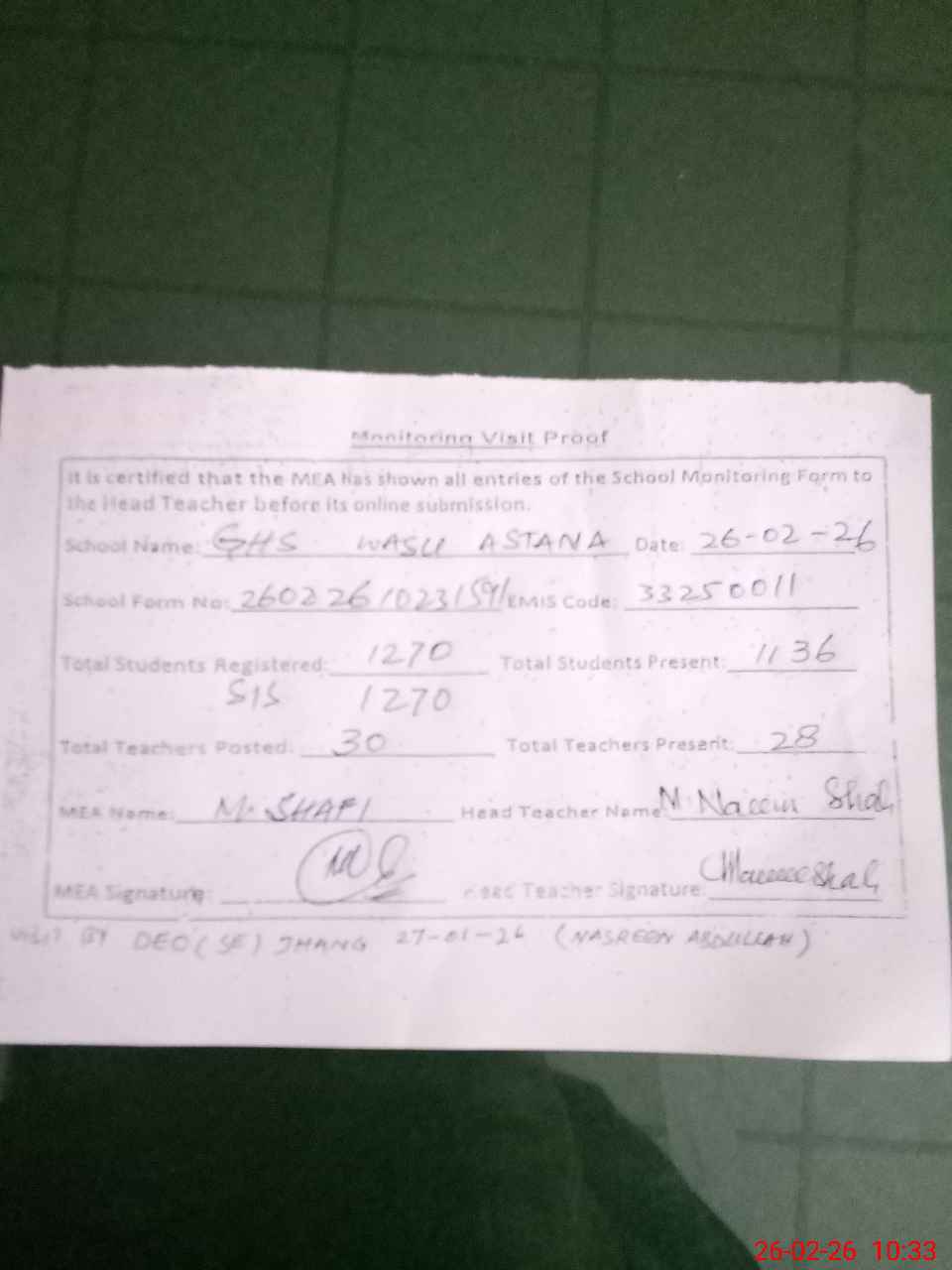 | EMIS Code: 33250011 | Name of School: GHS WASU ASTANA | |||