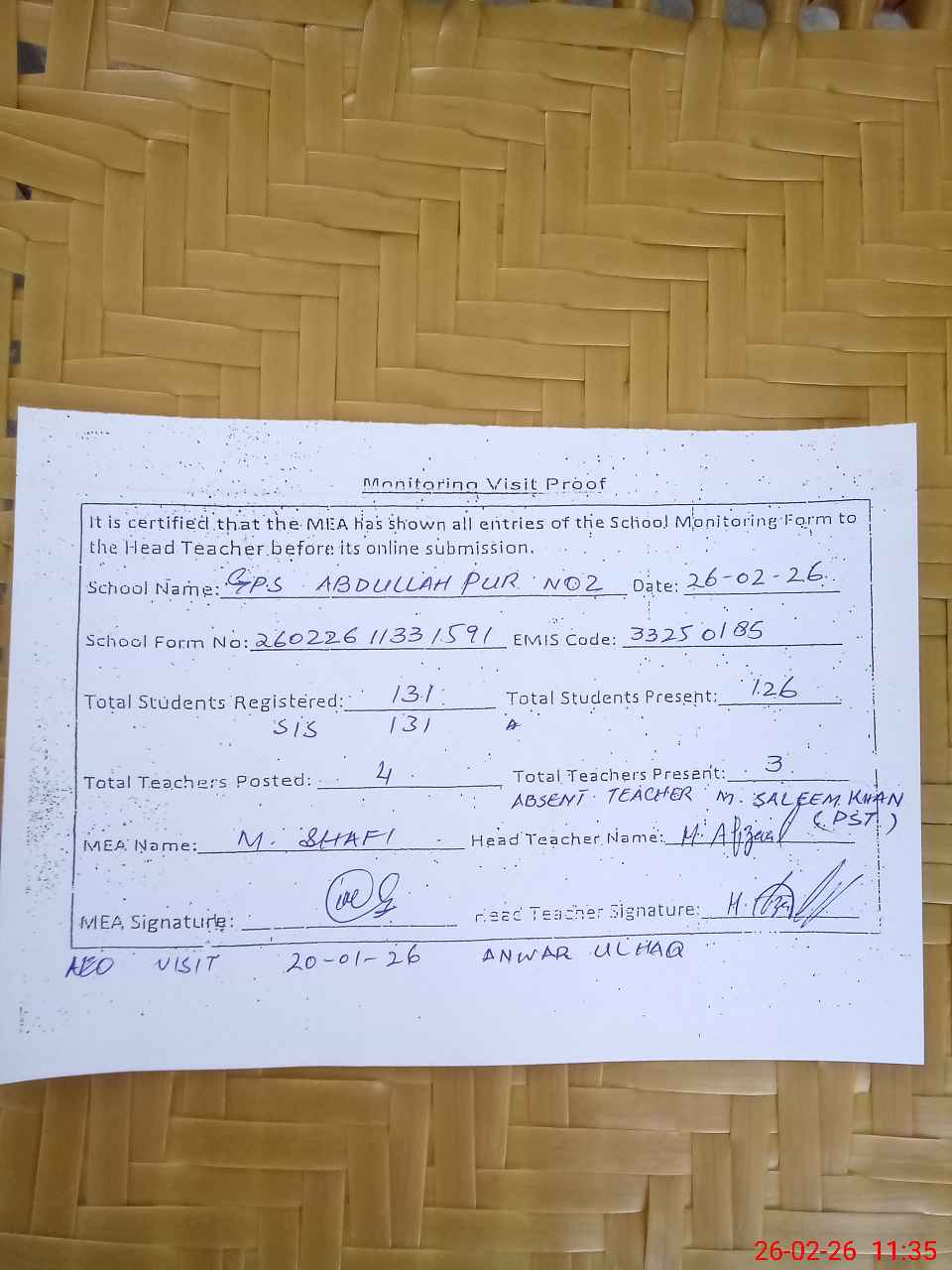 | Attendance Register | Head Teacher | MEA with School | Visit Proof |