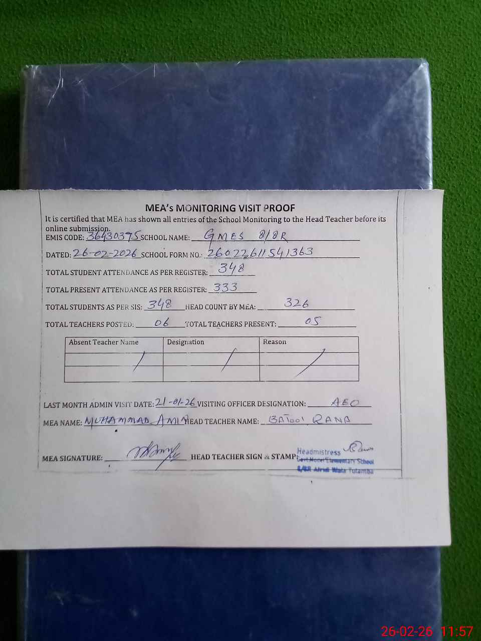 | Attendance Register | Head Teacher | MEA with School | Visit Proof |