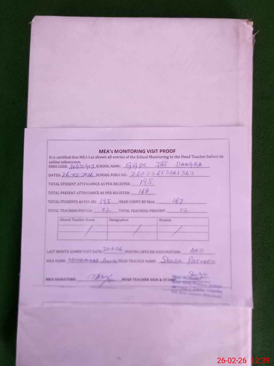 | Attendance Register | Head Teacher | MEA with School | Visit Proof |