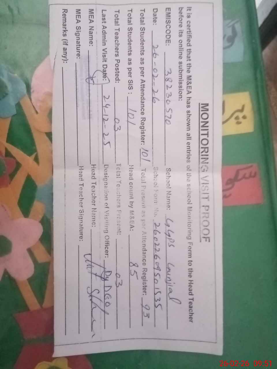 | Remarks (Use Separate Page if Required): Dy DEO visited school on 24 December 2025 students strength on sis 101 | |||||