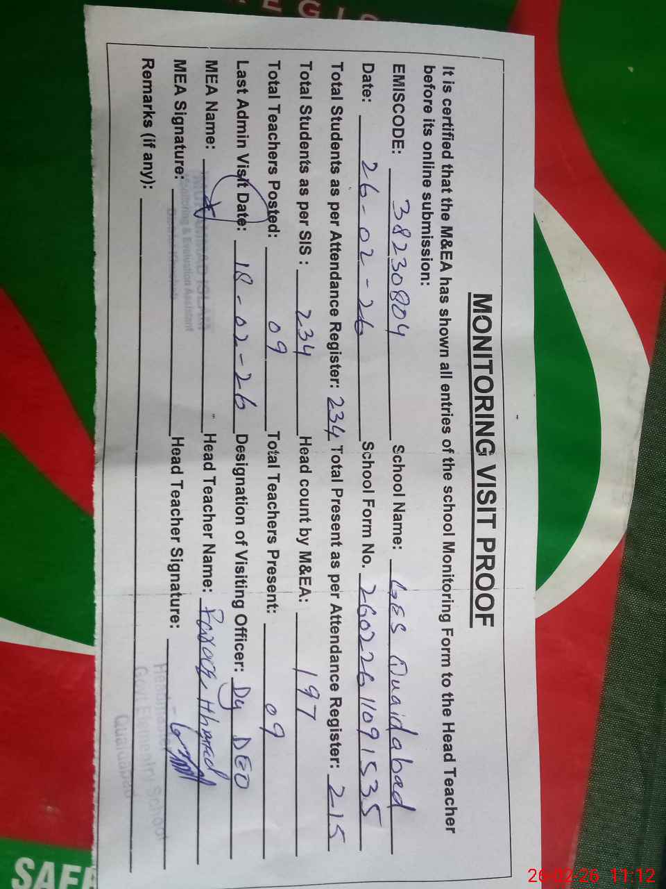 | Remarks (Use Separate Page if Required): Dy DEO visited school on 18 February 2025 students strength on sis 234 | |||||