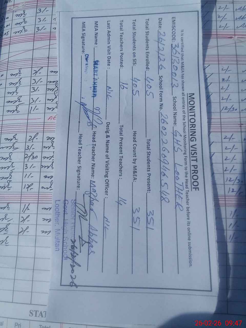 | EMIS Code: 36130013 | Name of School: GHS LOOTHER MULTAN | |||