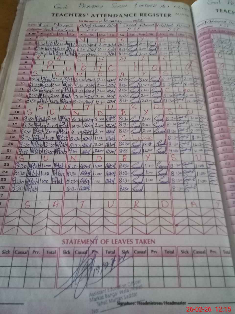 | 36**** | Mu**** Ib**** | CHOWKIDAR | Regular | 0 | 0 | 0 | 0 | 0 | 0 | 0 | 0 | 0 | Absent (Un-Authorized) |
