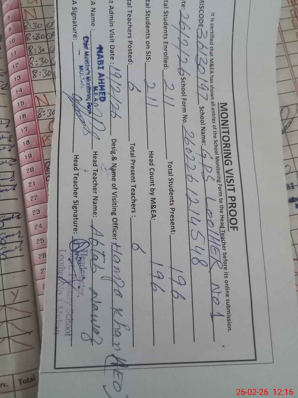 | Attendance Register | Head Teacher | MEA with School | Visit Proof |