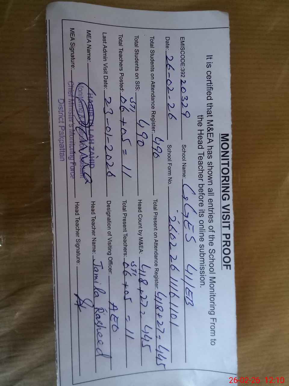 | Attendance Register | Head Teacher | MEA with School | Visit Proof |