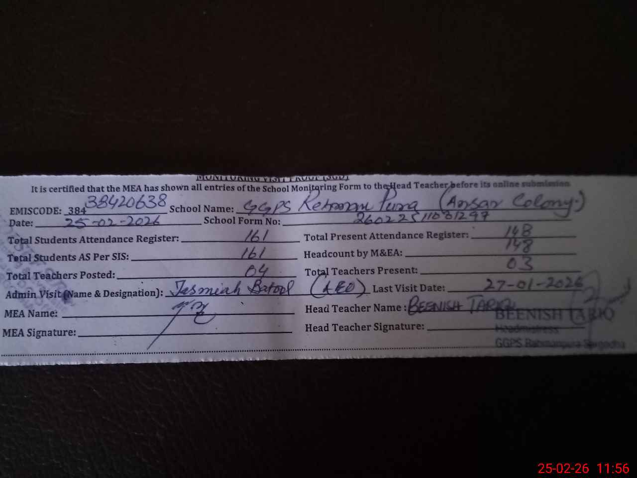 | Attendance Register | Head Teacher | MEA with School | Visit Proof |