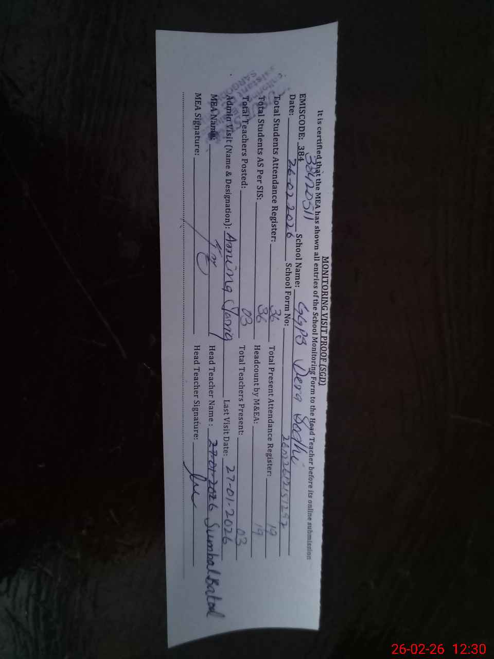 | Attendance Register | Head Teacher | MEA with School | Visit Proof |