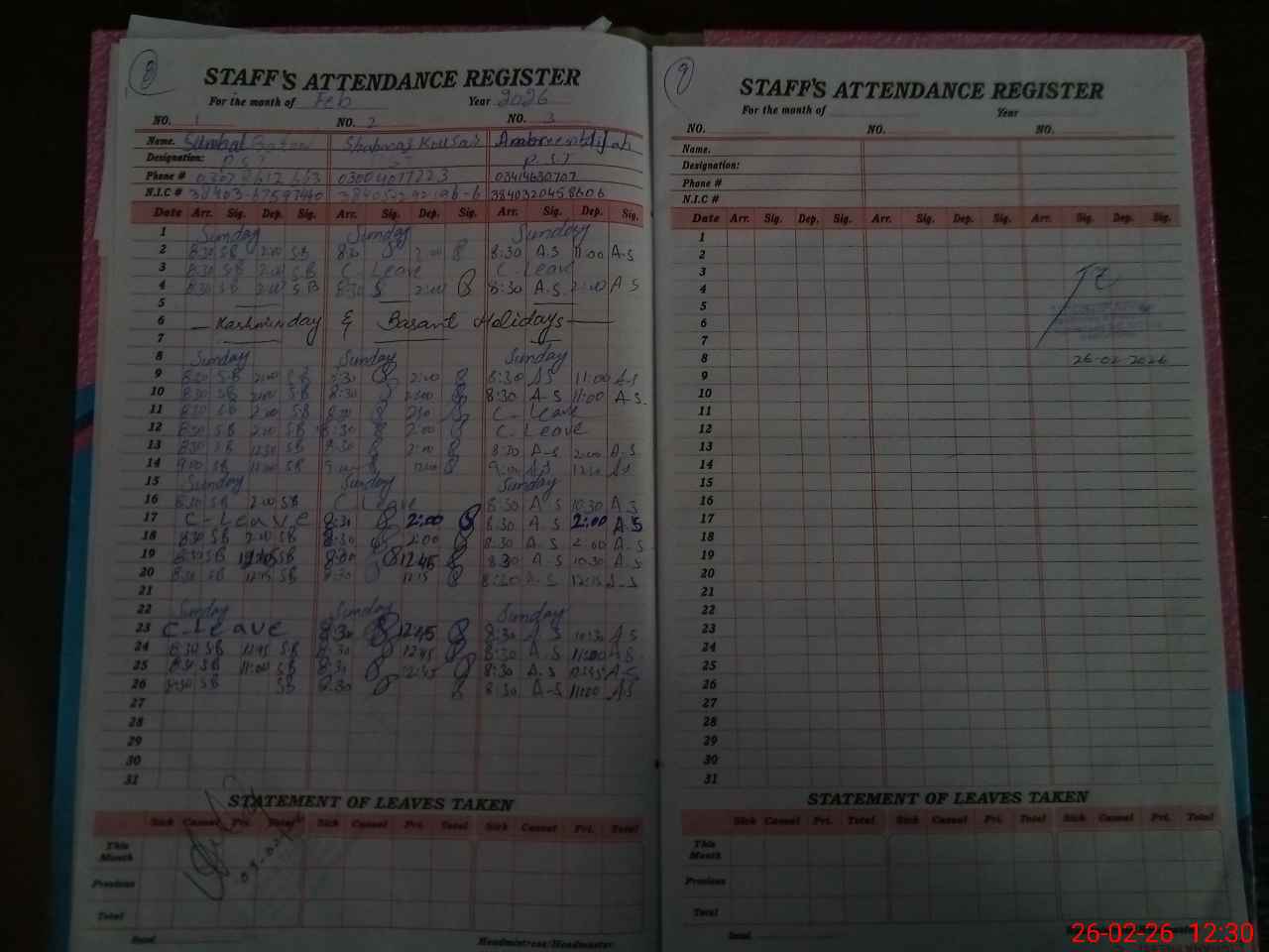 | CNIC | Full Name | Designation | R/C | Absence During Last Calender Month |