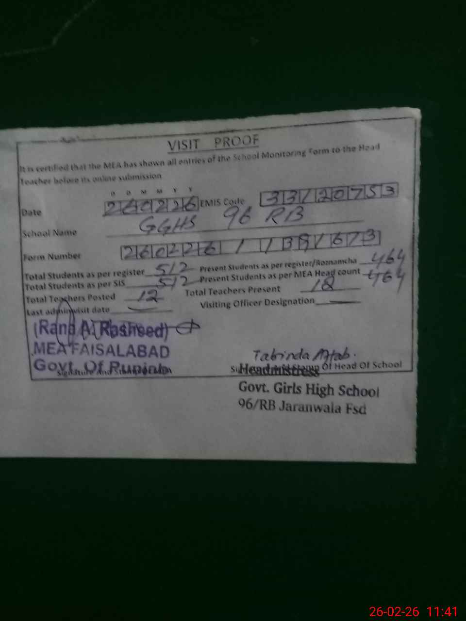 | EMIS Code: 33120753 | Name of School: GGHS CHAK 96 RB | |||