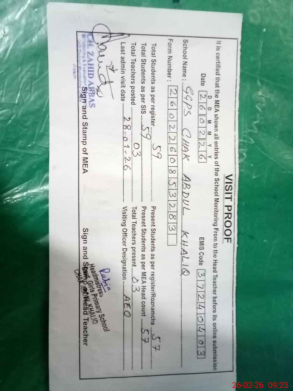 | EMIS Code: 37240403 | Name of School: GGPS CHAK ABDUL KHALIQ | |||