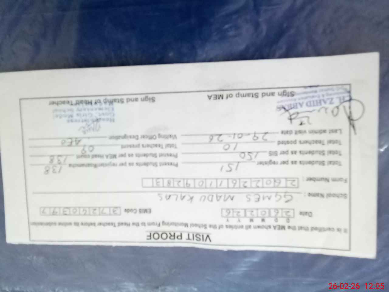 | Certified that this School was Inspected by the Undersigned MEA/DMO Today and the Information Stated Above is as Per Record. | |||||