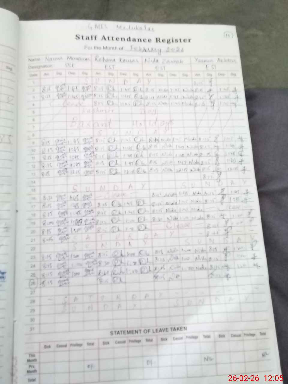 | Monitoring Date: 26-02-2026 | Start Time: 26-02-2026 11:09 AM | End Time: 26-02-2026 12:06 PM | Name of MEA: Za**** Ab**** | |