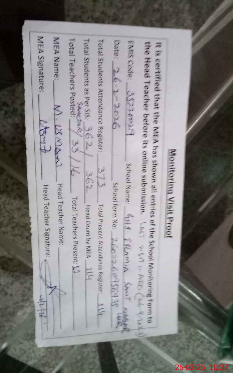 | Remarks (Use Separate Page if Required): 04 teachers named Shaukat Ali, Muhammad Shahzad Akhtar, Qayyum Ejaz and NIDA Mehmood marked absent due to leave record was not available. we Mali named Muhammad Atta Marked absent due to valid temporary duty letter is not available. Text books of class 1, class 6, and class 7 not received 10 class rooms are repairable NSB and FTF registers not available. Teachers not available in primary section, only 01 teacher is available where as stand by teachers are available and 01 teacher named Hafiz Muhammad Qasim was free and busy in mobile. Maximum Students of 9th and 10th class are absent since August, 2025. | |||||