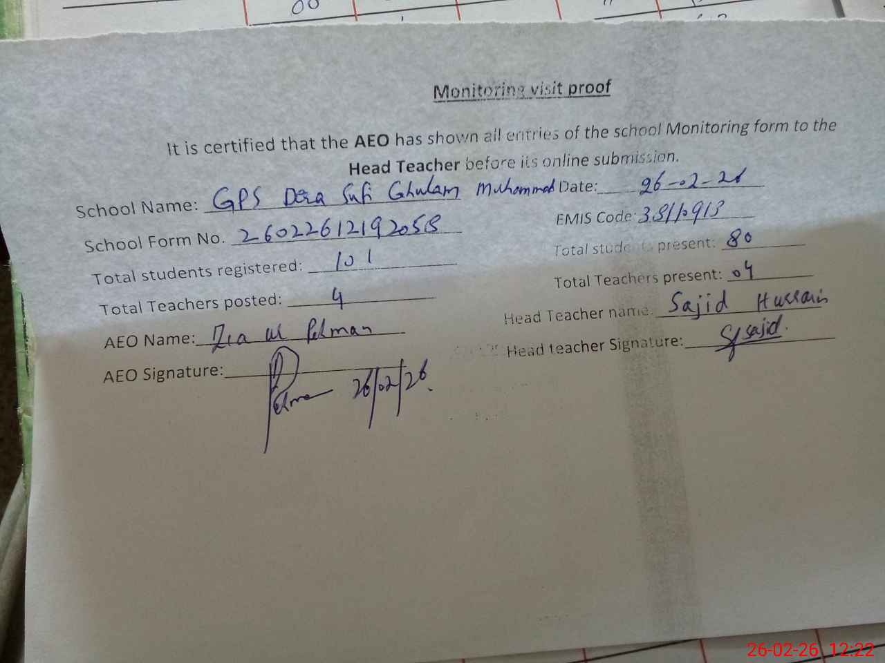 | Attendance Register | Head Teacher | MEA with School | Visit Proof |