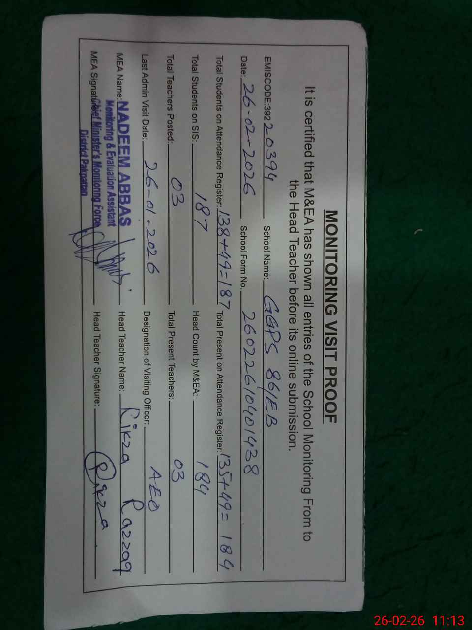 | EMIS Code: 39220394 | Name of School: GGPS 86/EB ARIFWALA | |||