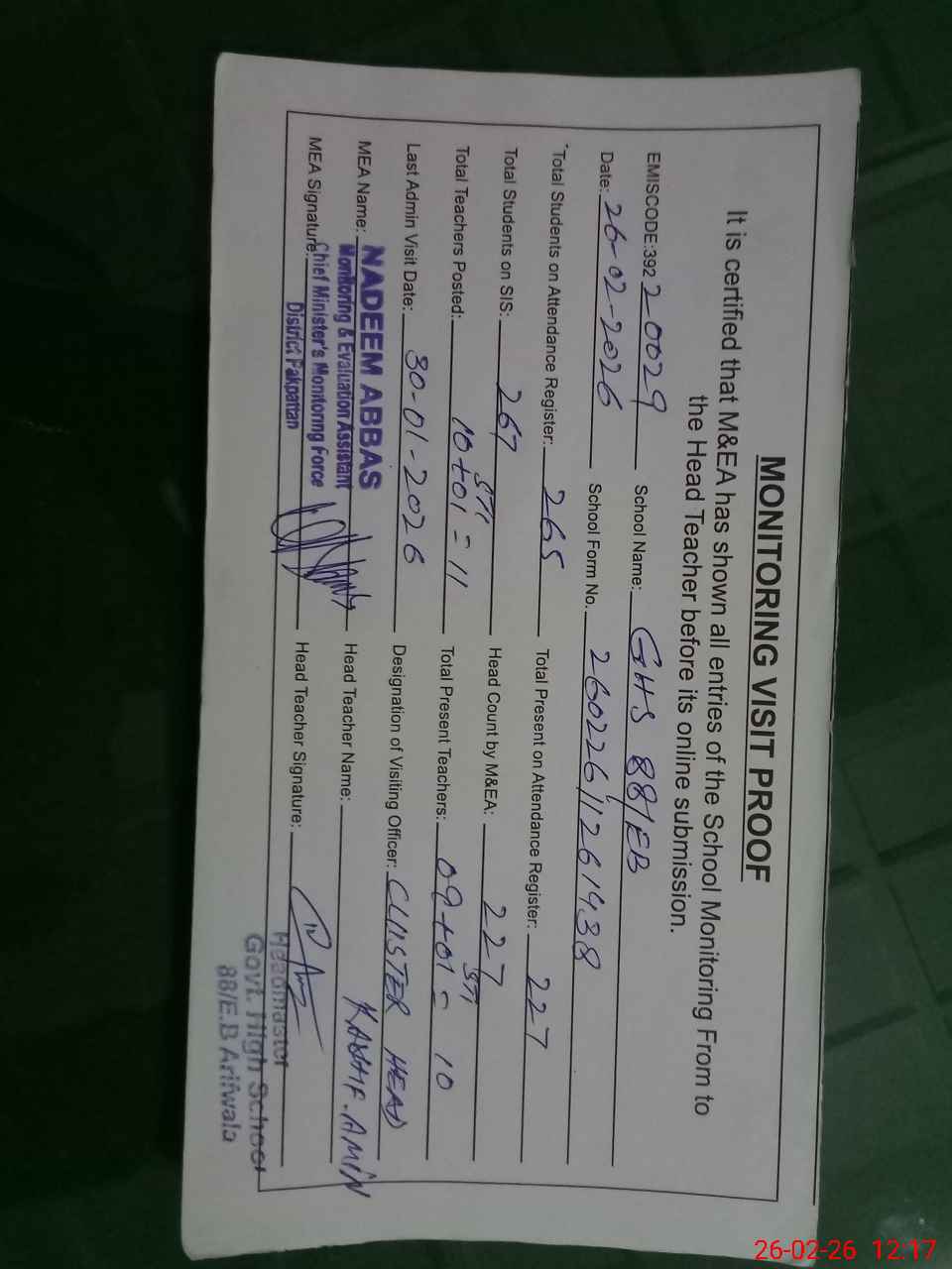 | Attendance Register | Head Teacher | MEA with School | Visit Proof |