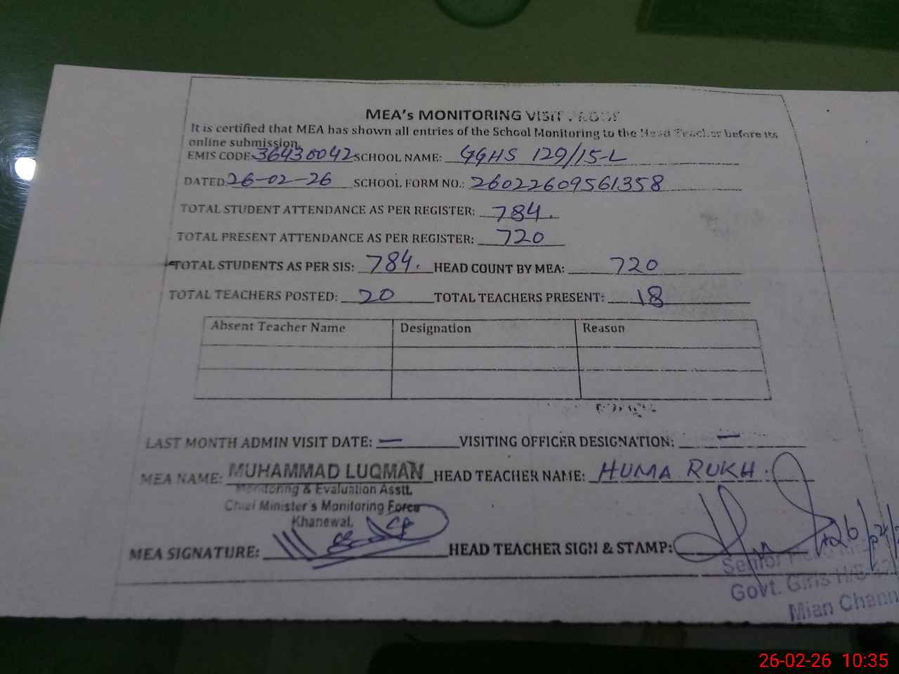 | EMIS Code: 36430042 | Name of School: GGHS 129/15-L, MIAN CHANNU | |||