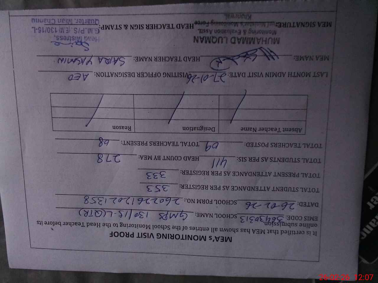 | Attendance Register | Head Teacher | MEA with School | Visit Proof |