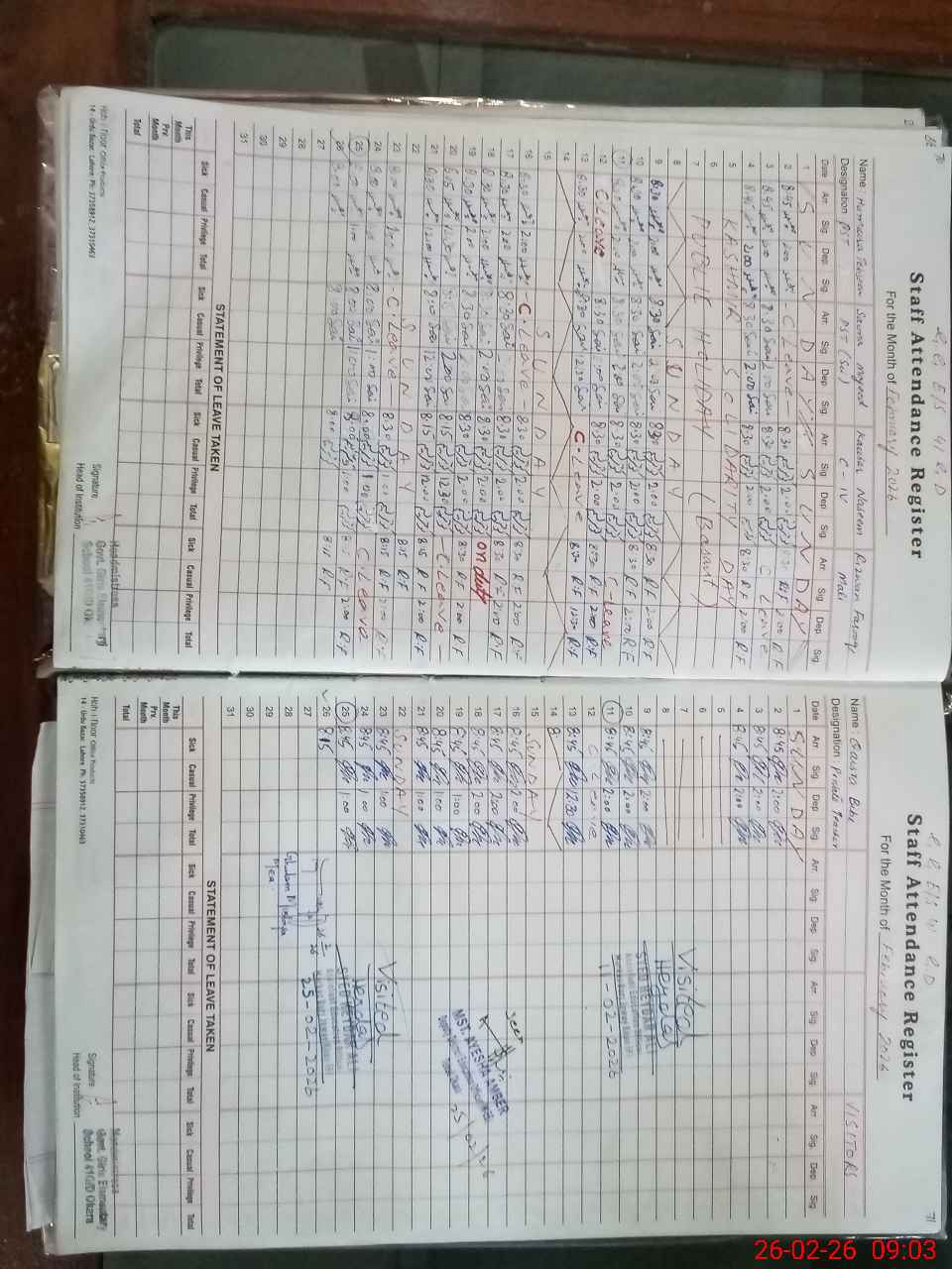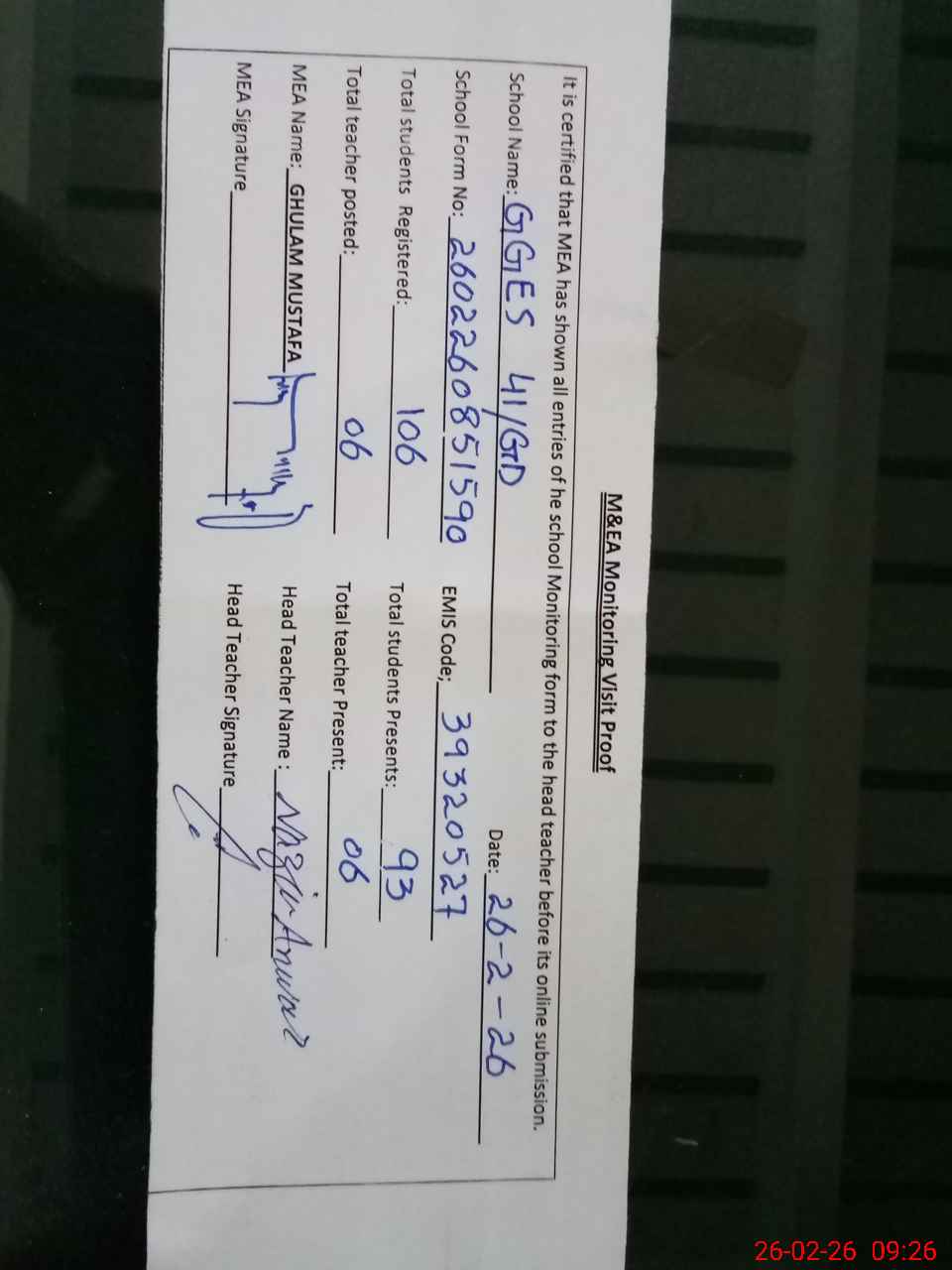 | Attendance Register | Head Teacher | MEA with School | Visit Proof |