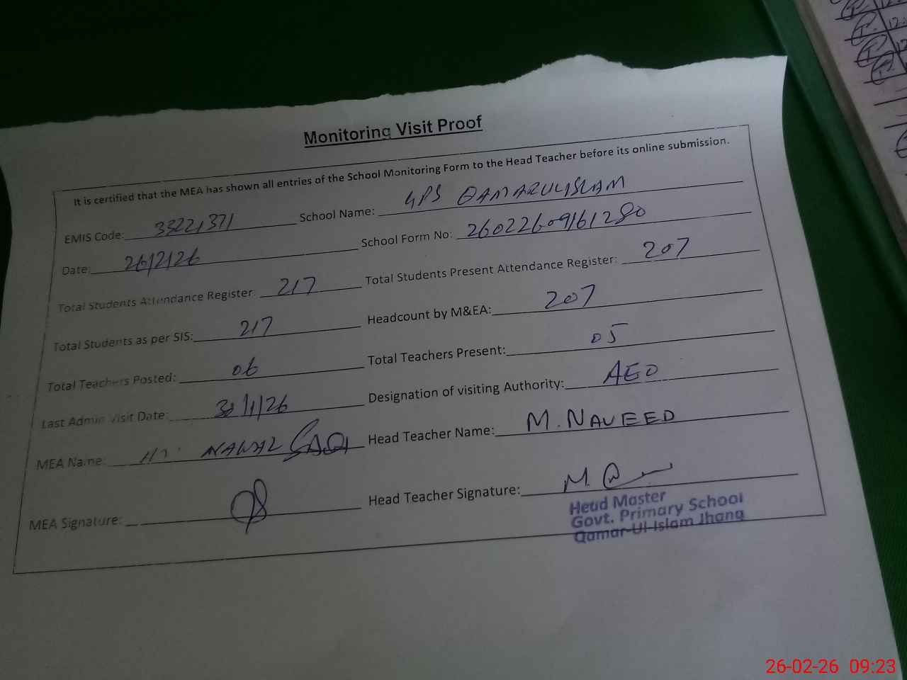 | Attendance Register | Head Teacher | MEA with School | Visit Proof |