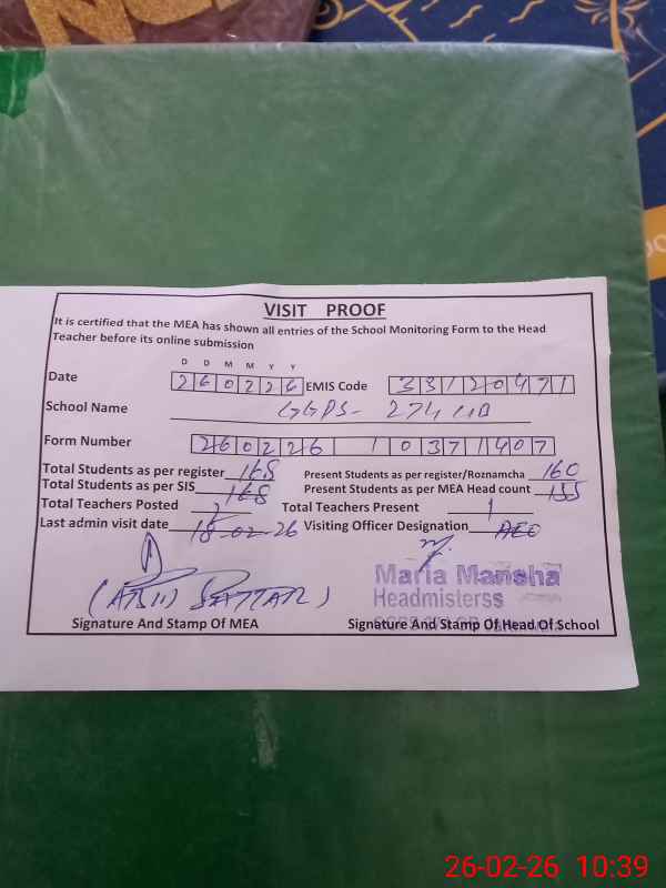 | Certified that this School was Inspected by the Undersigned MEA/DMO Today and the Information Stated Above is as Per Record. | |||||