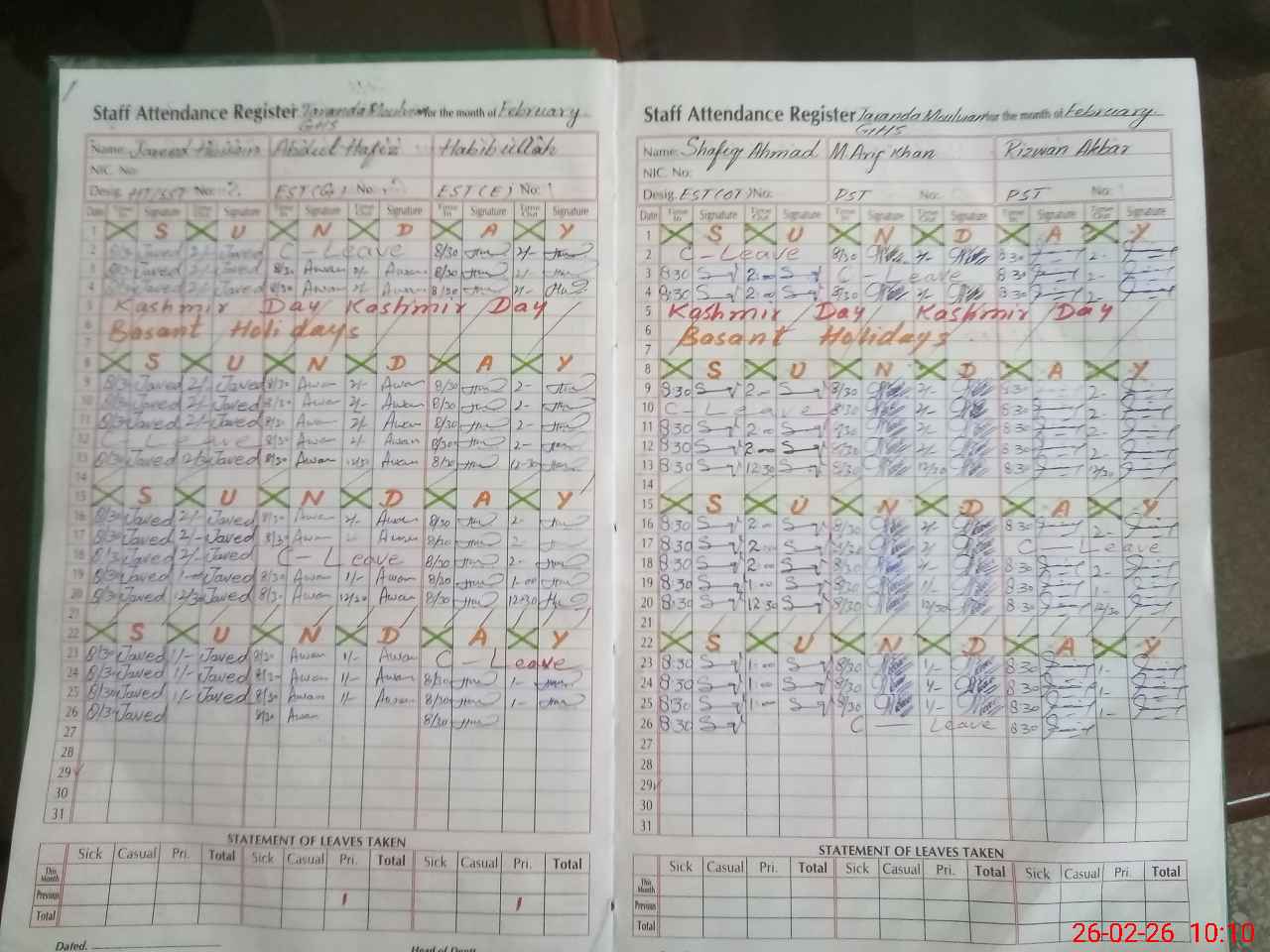 | CNIC | Full Name | Designation | R/C | Absence During Last Calender Month |
