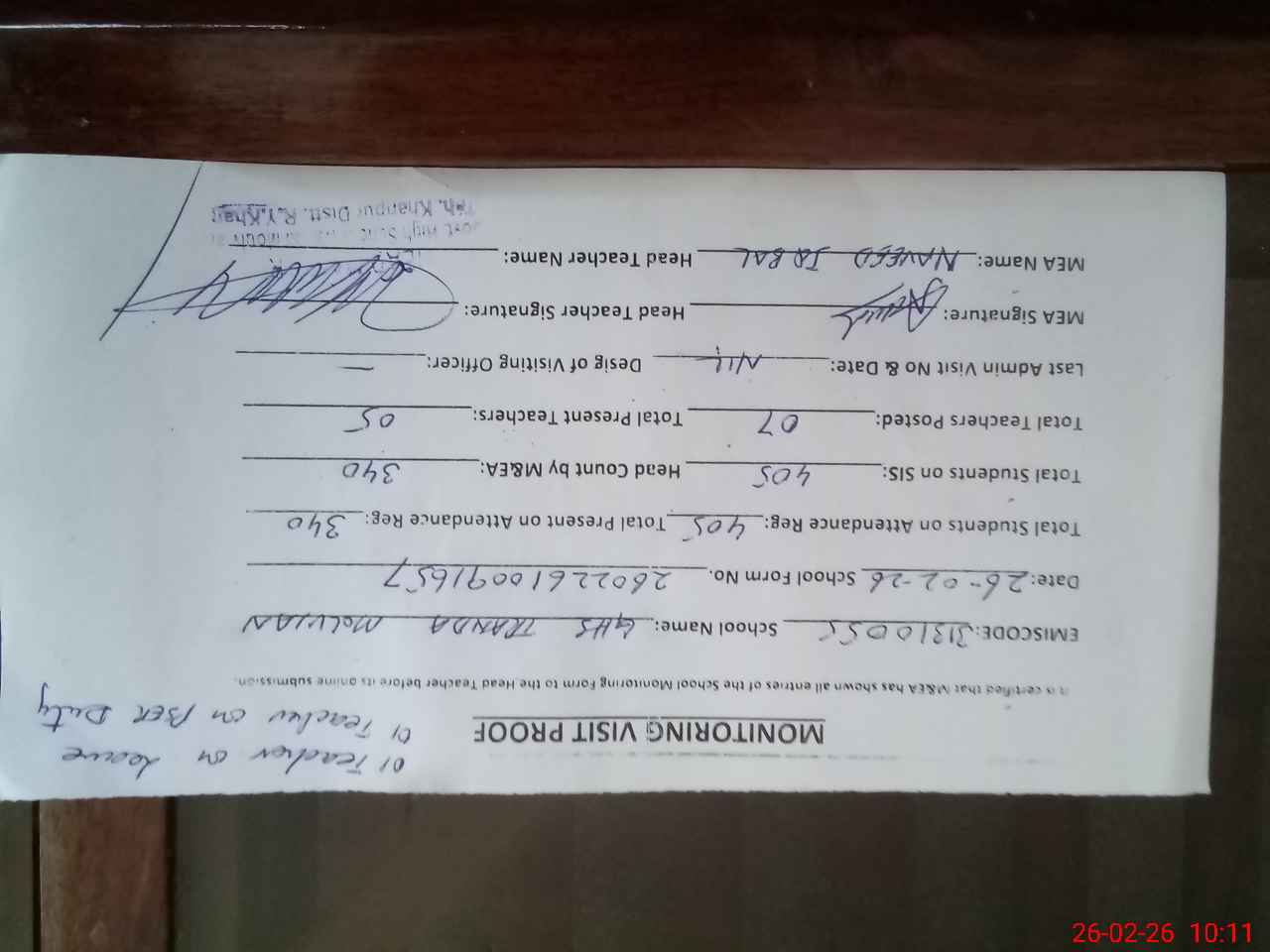 | Certified that this School was Inspected by the Undersigned MEA/DMO Today and the Information Stated Above is as Per Record. | |||||