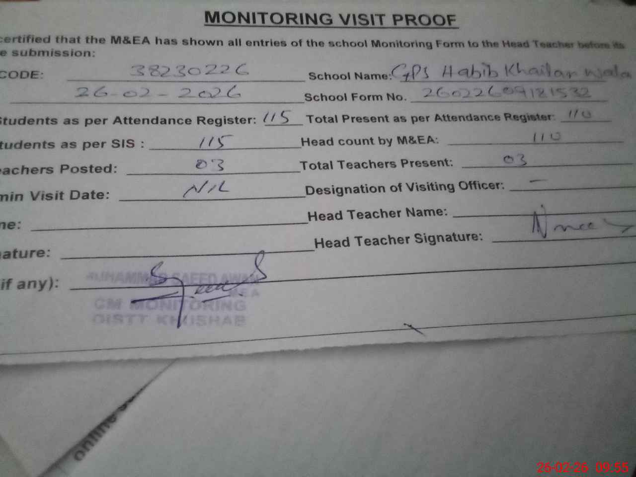 | Attendance Register | Head Teacher | MEA with School | Visit Proof |