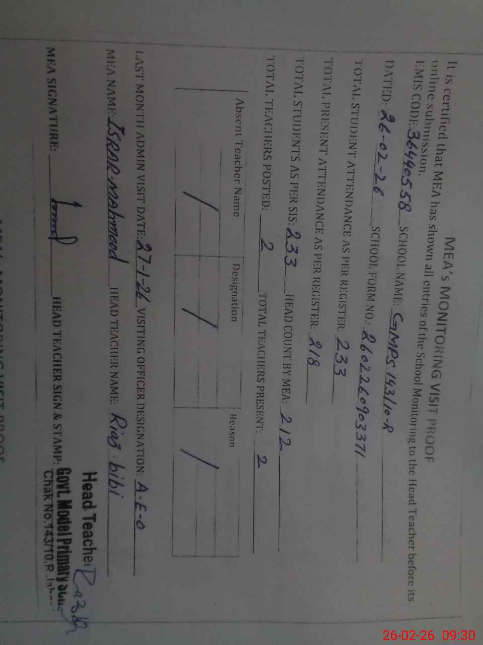 | Attendance Register | Head Teacher | MEA with School | Visit Proof |