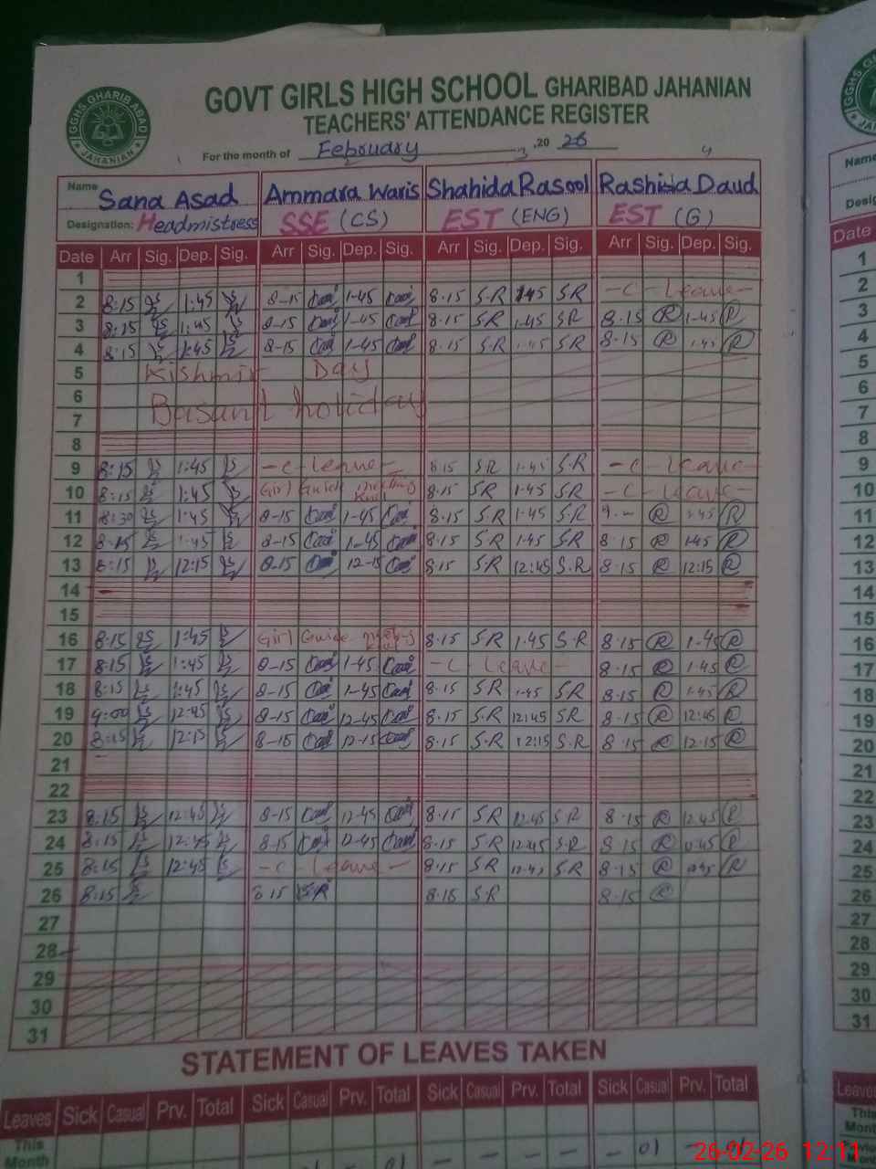 | CNIC | Full Name | Designation | R/C | Absence During Last Calender Month |