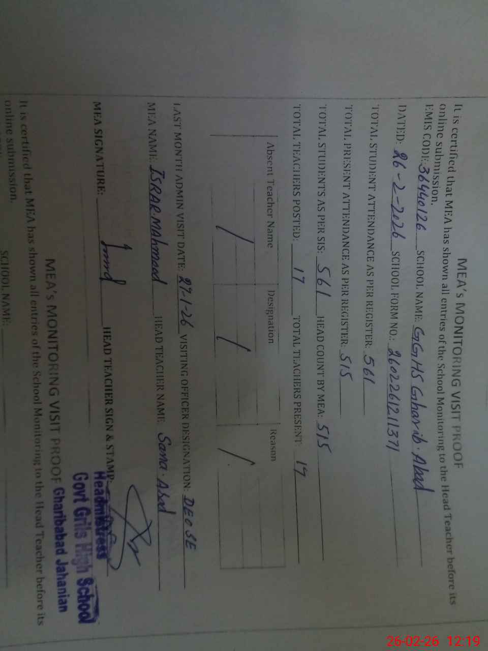 | Certified that this School was Inspected by the Undersigned MEA/DMO Today and the Information Stated Above is as Per Record. | |||||
