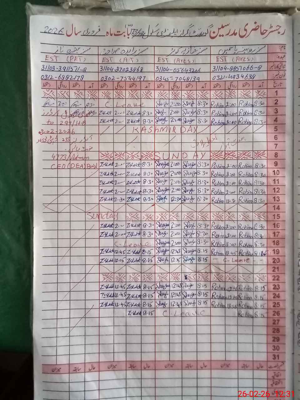 | CNIC | Full Name | Designation | R/C | Absence During Last Calender Month |