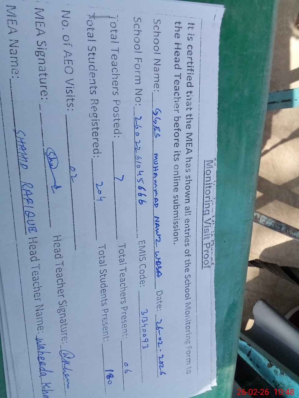 | Certified that this School was Inspected by the Undersigned MEA/DMO Today and the Information Stated Above is as Per Record. | |||||