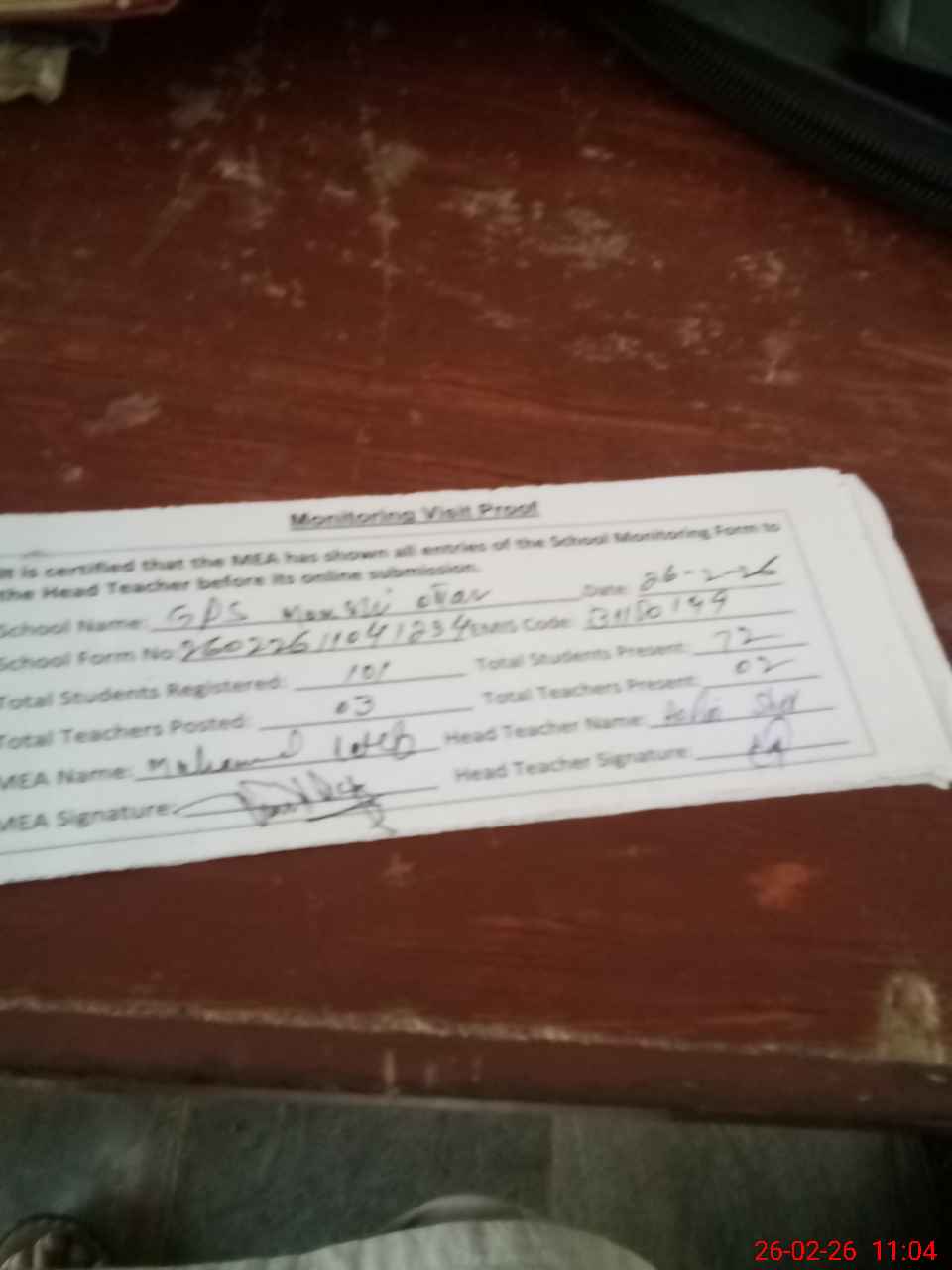 | Attendance Register | Head Teacher | MEA with School | Visit Proof |