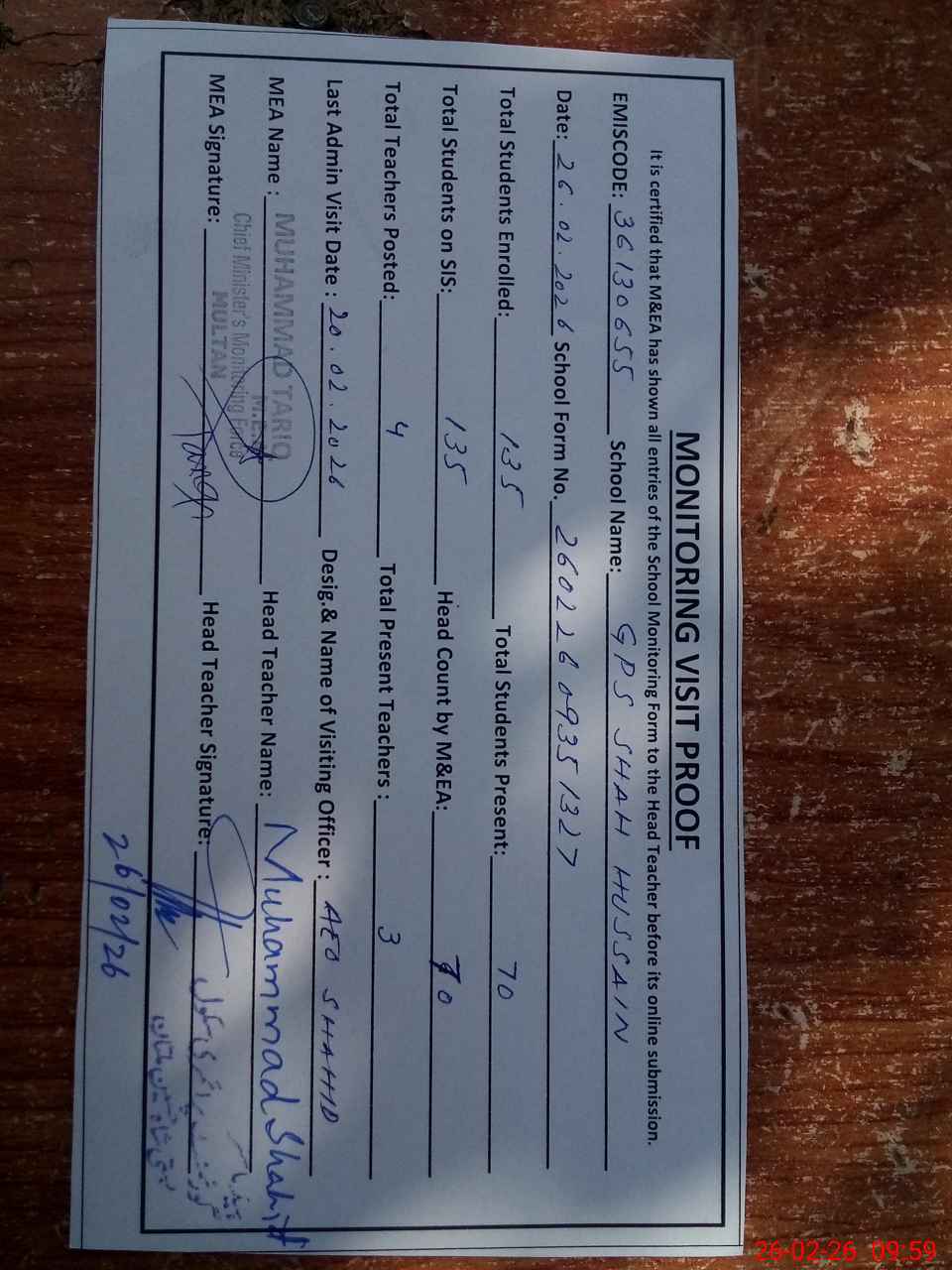| Attendance Register | Head Teacher | MEA with School | Visit Proof |