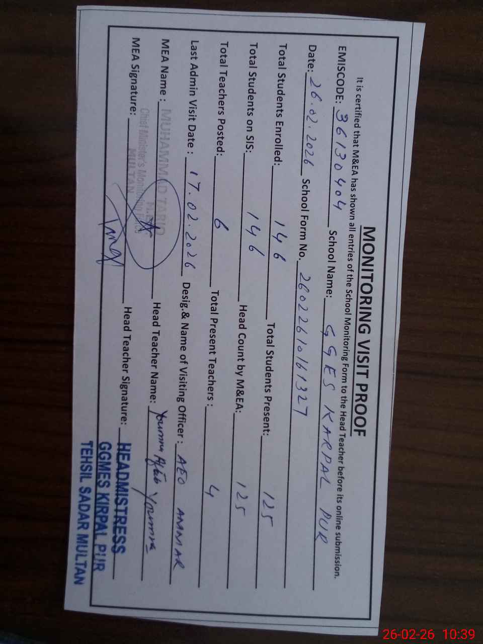 | Certified that this School was Inspected by the Undersigned MEA/DMO Today and the Information Stated Above is as Per Record. | |||||
