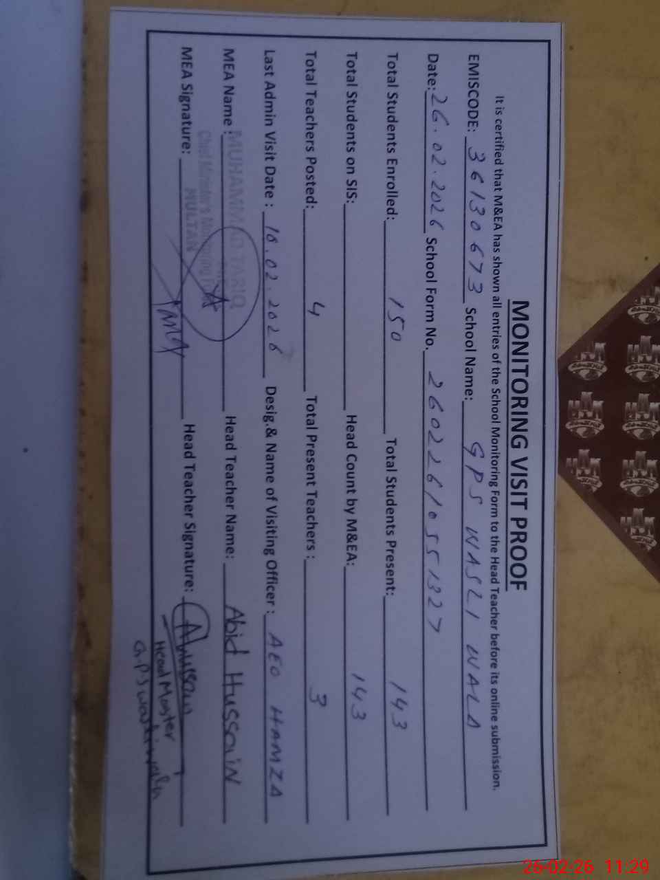 | Attendance Register | Head Teacher | MEA with School | Visit Proof |