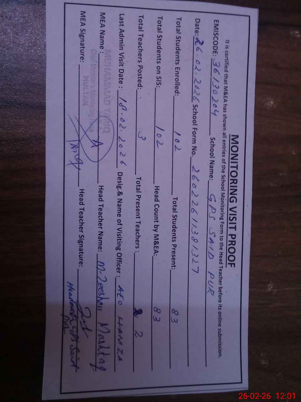 | Attendance Register | Head Teacher | MEA with School | Visit Proof |