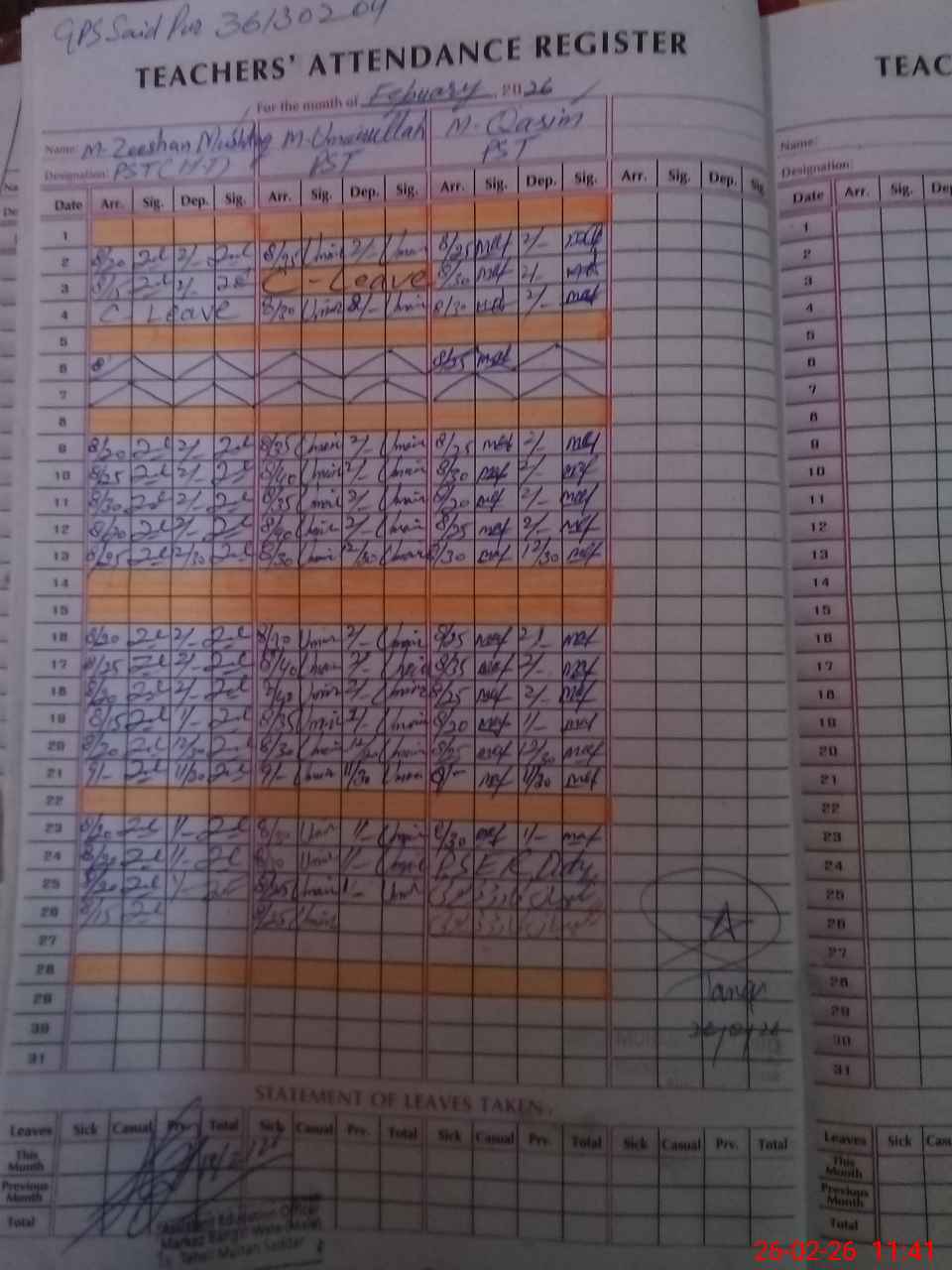 | CNIC | Full Name | Designation | R/C | Absence During Last Calender Month |