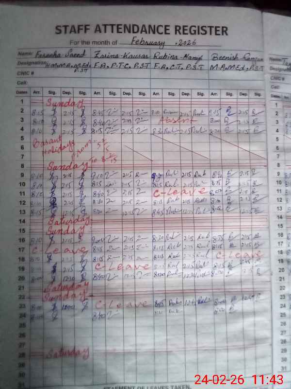 | CNIC | Full Name | Designation | R/C | Absence During Last Calender Month |