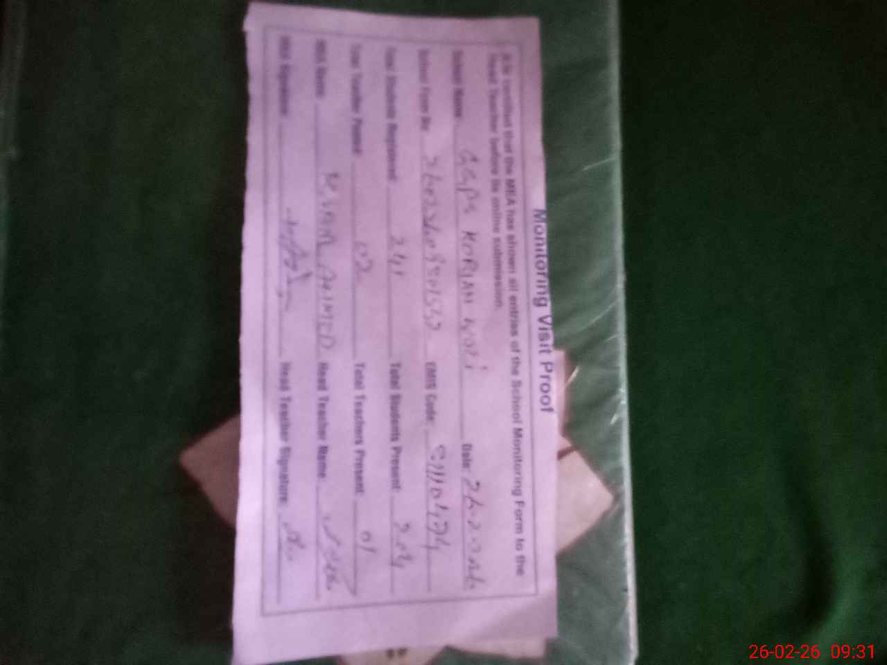 | Attendance Register | Head Teacher | MEA with School | Visit Proof |