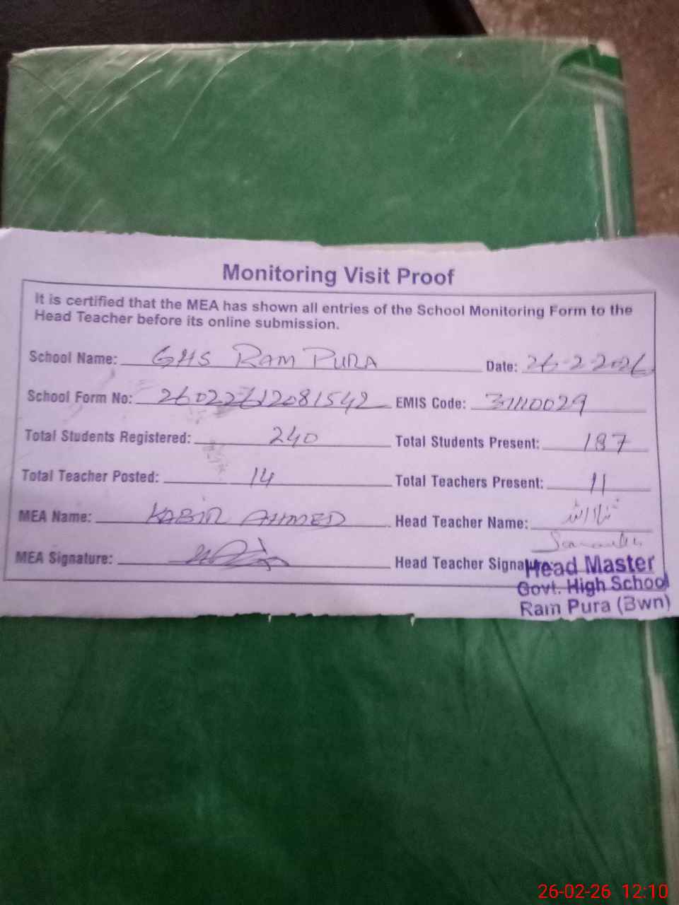 | Attendance Register | Head Teacher | MEA with School | Visit Proof |