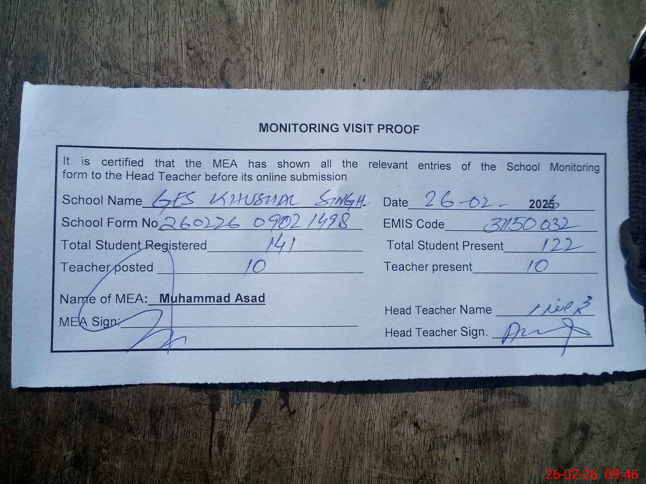 | Attendance Register | Head Teacher | MEA with School | Visit Proof |