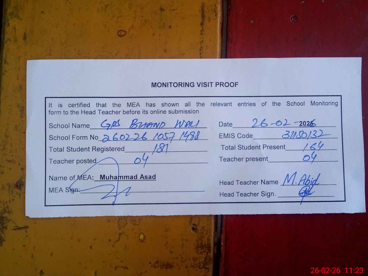 | EMIS Code: 31150132 | Name of School: GPS BHAND WALI | |||