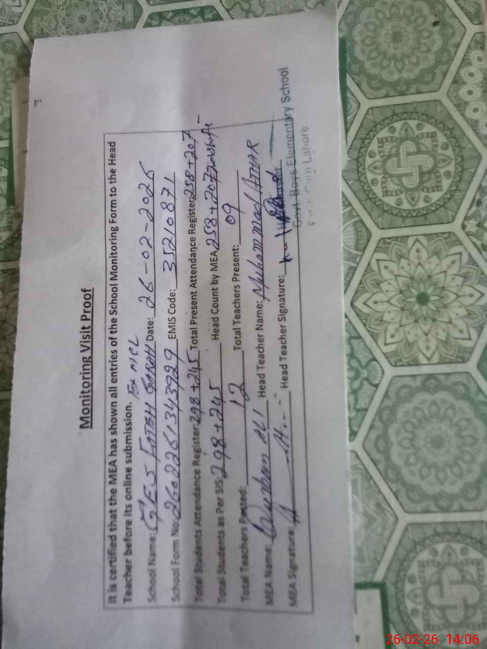 | Attendance Register | Head Teacher | MEA with School | Visit Proof |