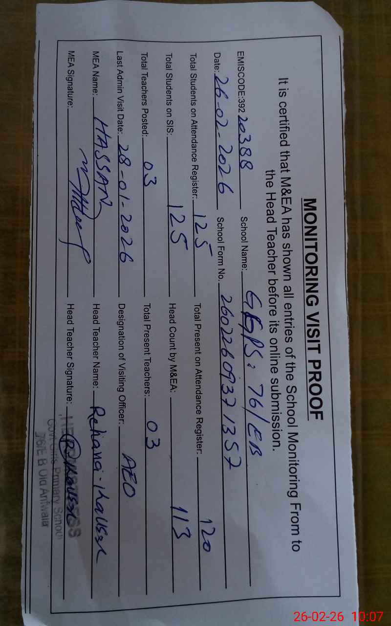 | EMIS Code: 39220388 | Name of School: GGPS 76 EB ARIFWALA | |||