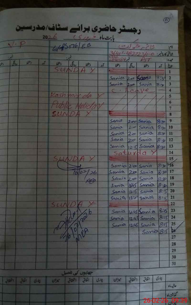 | CNIC | Full Name | Designation | R/C | Absence During Last Calender Month |