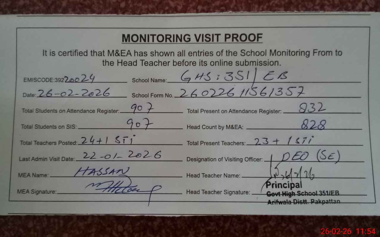 | EMIS Code: 39220024 | Name of School: GHS 351/EB ARIFWALA | |||